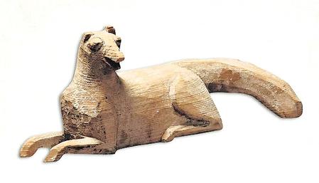 狗俑長(zhǎng)度在14-24厘米左右。先雕刻出輪廓,墨色線條勾出眼、耳及身上的毛發(fā),造型多樣,且以臥木狗俑較多,雙耳豎立,頭搭在前伸的雙腿或前爪上。這其中不僅有原木色作底、墨線勾勒的臥姿木狗俑,還有通體施白漆,墨線描繪耳、嘴、眼、前爪及背部、尾部的鬃毛,雕刻成分甚少,無(wú)任何肢體動(dòng)作,卻唯獨(dú)將雙耳豎起,展現(xiàn)警覺(jué)性的臥姿木狗俑。
