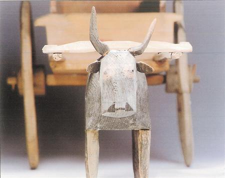 木牛俑高度約20厘米左右,通常先雕出輪廓,然后通體飾黑彩,白彩勾眼和絡(luò)頭等。從造型來(lái)看,木牛目視前方,屈背,四足蹬地,身軀健壯有力。拉著牛車或拉木犁的牛俑一般繪有絡(luò)頭,表現(xiàn)了田間勞作的情景。到西漢時(shí)期,隨著“軍事屯田”與“徙民實(shí)邊”政策的推行,牛耕技術(shù)在甘肅河西地區(qū)逐漸普及開(kāi)來(lái)。