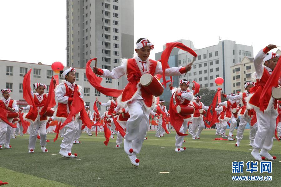 11月4日,蘭州市桃樹坪小學(xué)學(xué)生在活動(dòng)現(xiàn)場(chǎng)表演歡慶腰鼓。當(dāng)日,甘肅省蘭州市城關(guān)區(qū)學(xué)校體育“一校一品”現(xiàn)場(chǎng)展示活動(dòng)在蘭州市第五十四中學(xué)舉行,16所學(xué)校進(jìn)行了特色校園體育項(xiàng)目表演。據(jù)介紹,蘭州市城關(guān)區(qū)現(xiàn)已推廣各類體育項(xiàng)目40余項(xiàng),命名“體育特色項(xiàng)目示范校”42所。 新華社記者 張智敏 攝