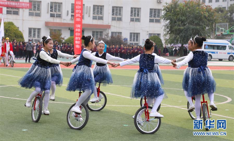 11月4日,蘭州市伏龍坪小學(xué)學(xué)生在活動(dòng)現(xiàn)場(chǎng)進(jìn)行獨(dú)輪車表演。新華社記者 張智敏 攝