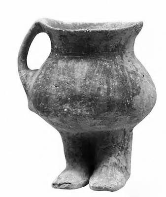 最特別的就是他雙腳上的鞋子,看上去完全是一雙高腰靴子,而且腳型巨大。陶器人體中空,可以盛水,插入褲兜的雙臂形成陶罐的雙耳,設(shè)計(jì)十分大膽精巧。