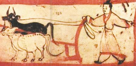 此后,在酒泉丁家閘十六國(guó)墓壁畫中就只有一牛牽引的雙轅犁了。說(shuō)明魏晉時(shí)期是中國(guó)從二牛單轅犁過(guò)渡到一牛挽拉雙轅犁的時(shí)代,這一過(guò)渡的狀況及特點(diǎn)出現(xiàn)在嘉峪關(guān)地主墓葬壁畫中,又說(shuō)明甘肅是這一重大農(nóng)技改革的地區(qū)之一。