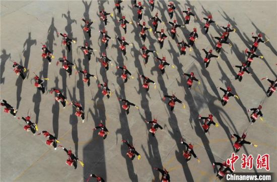 圖為甘肅武威市涼州區(qū)四壩鎮(zhèn)九年制學校的學生練習攻鼓子?!钇G敏 攝