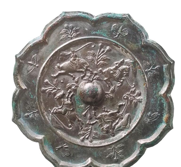 隋唐時(shí)期是中國封建政治經(jīng)濟(jì)文化高度發(fā)展繁榮的時(shí)期,唐代社會經(jīng)濟(jì)全面發(fā)展,手工業(yè)各部門也都興旺發(fā)達(dá),青銅鑄造業(yè)中的銅鏡業(yè)尤為突出,無論造型、題材、紋飾、鑄造工藝,都突破了前代的模式,達(dá)到了中國古代銅鏡藝術(shù)的巔峰。唐鏡鏡型厚實(shí),方形鏡、菱花形鏡、葵花形鏡流行;紋飾題材多見瑞獸、飛鳥以及葡萄、花草等;瑞獸葡萄鏡最具特色,是中西文化融合的杰作。