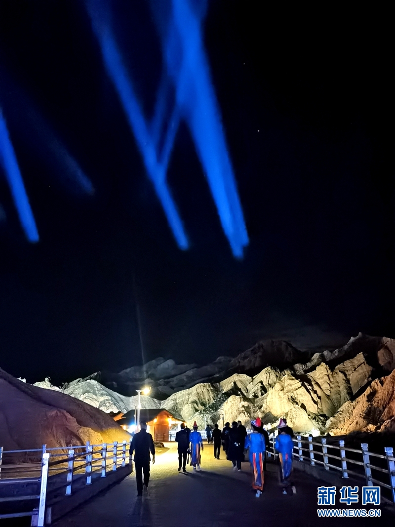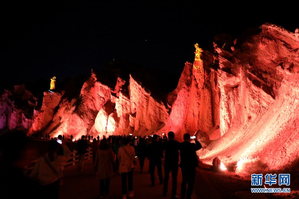 七彩丹霞與燈光秀融合,呈現(xiàn)了一場(chǎng)精彩紛呈的視覺(jué)盛宴。新華網(wǎng)發(fā)(王生元 攝)