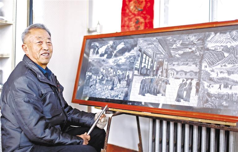 接下來就是耗費(fèi)工時與體力的制作過程,“每天創(chuàng)作雕刻都在三四個小時,每分鐘在刻板的敲擊次數(shù)達(dá)到近200次,每小時敲擊次數(shù)達(dá)到8000-12000次,9大板塊在創(chuàng)作過程中就要敲擊近16億次點(diǎn),每個板塊耗時10-11個月,9大板塊共耗時3000多天。”陶世清細(xì)數(shù)著創(chuàng)作的艱辛。