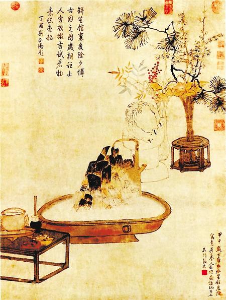 類似的畫(huà)作還有明代吳門(mén)畫(huà)派張宏的作品。畫(huà)面中心的榾柮爐中溫著一壺酒。后側(cè)果盤(pán)中盛放佛手,插花的器物則是枯瘦的青銅花觚和清麗的白瓷瓶,所插之物相應(yīng)地配以墨線勾勒的梅柏和淡雅設(shè)色的天竹。