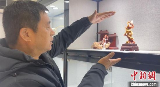 圖為玉雕手藝人李學平向記者展示自己用“巧雕”技藝雕刻的敦煌飛天系列作品。 高瑩 攝