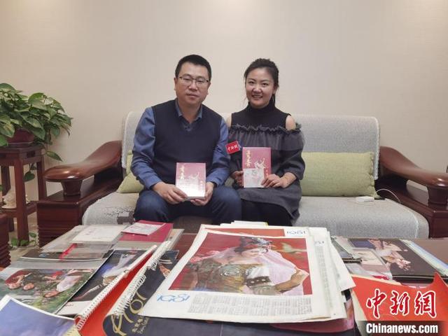 圖為陳曉斌(左)向中新網記者介紹他所收藏的舞劇《絲路花雨》相關珍貴資料情況?!〈蘖?nbsp;攝