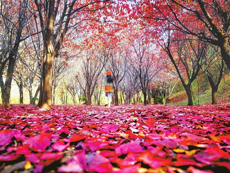 深秋的天水市秦州區(qū)南郭寺大景區(qū)被豐富多彩的顏色包圍,蜿蜒曲折的道路兩旁,各種樹木色彩斑斕、美不勝收。一陣微風(fēng)吹過,五彩斑斕的樹葉落到山間的步道上,鋪就了一層“多彩絢麗的地毯”。漫步其中,一幅人與自然各美其美、美美與共的美麗畫卷依山鋪就開來,迷醉游人。那一刻,詩圣杜甫《秦州雜詩》秋天里的南郭寺,在陽光的輝映下,滿目秋色皆是美景、皆是詩意。