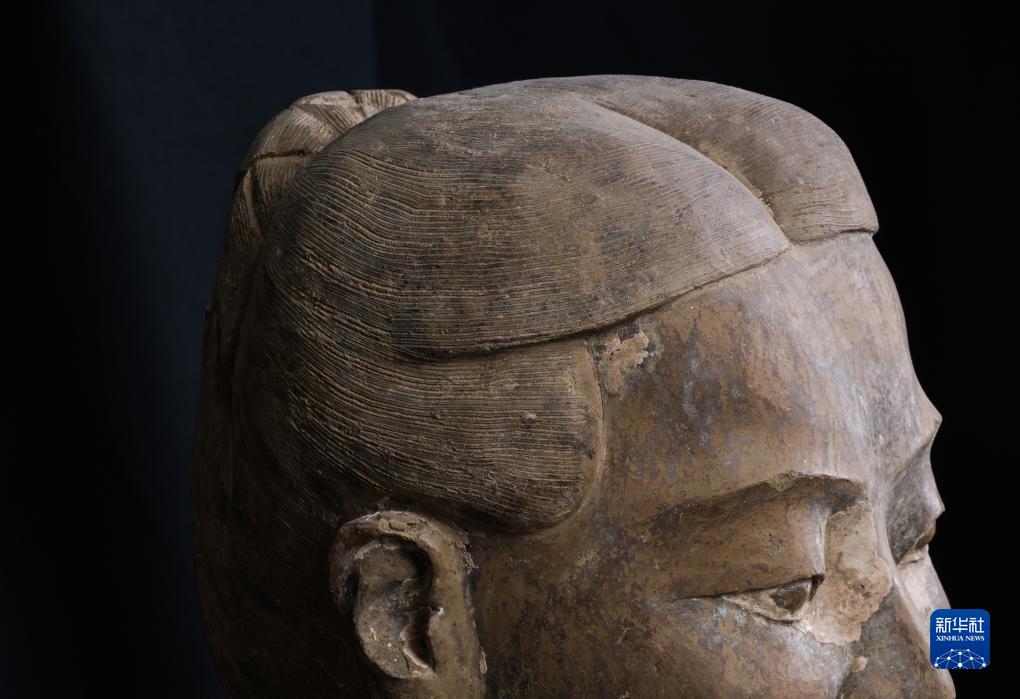 在秦始皇帝陵博物院文物保護(hù)部彩色陶俑修復(fù)室內(nèi),一尊秦俑的頭發(fā)分毫畢現(xiàn)( 8月23日攝)。