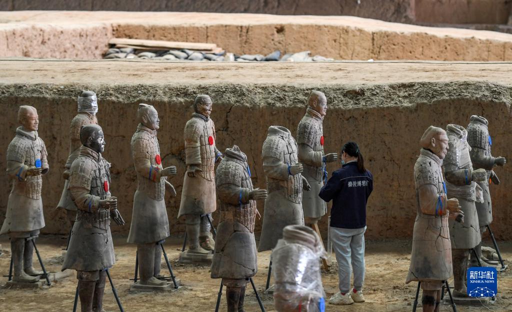 工作人員在秦兵馬俑一號坑遺址進(jìn)行秦俑修復(fù)(4月26日攝)。