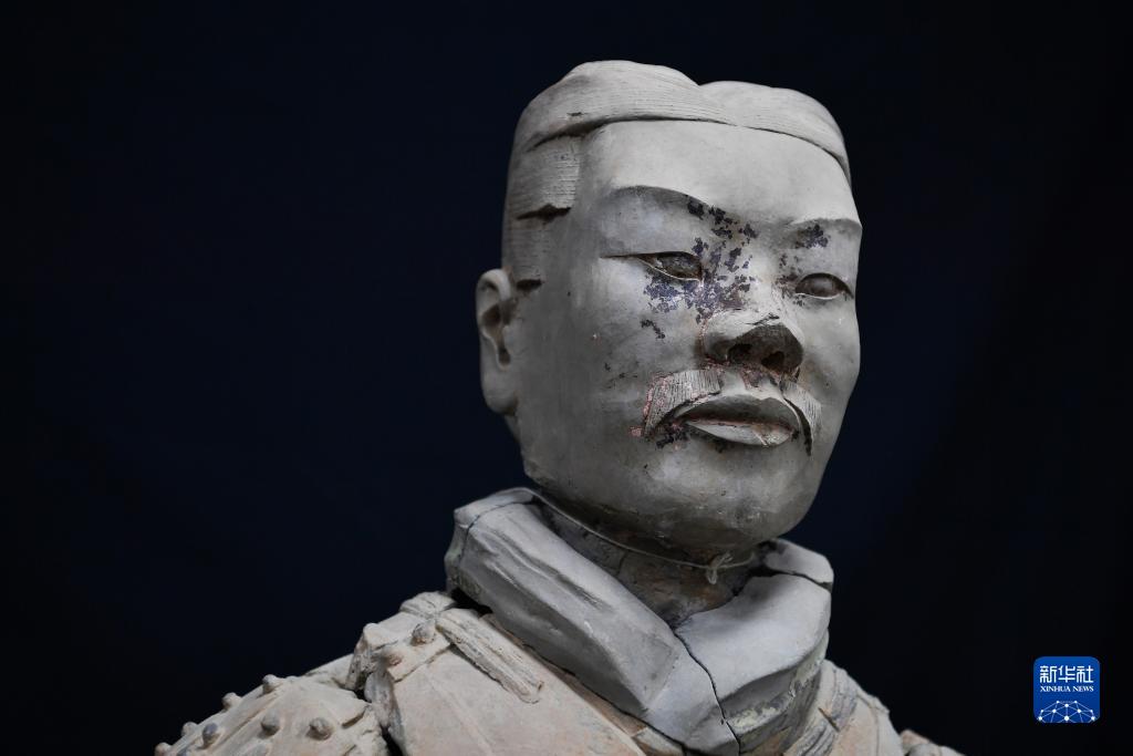 這是秦俑臉部和衣領(lǐng)上的彩繪還原修復(fù)后的樣貌(8月23日攝)。