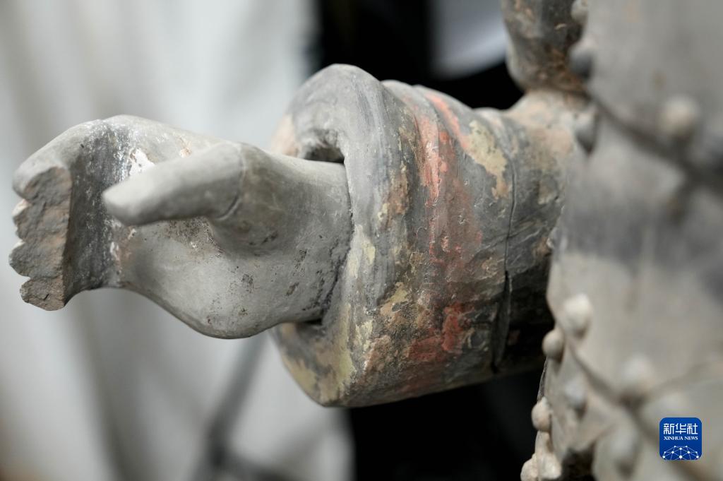 在秦始皇帝陵博物院文物保護(hù)部彩色陶俑修復(fù)室內(nèi),一尊秦俑的手部特寫顯示出豐富的細(xì)節(jié)(8月23日攝)。