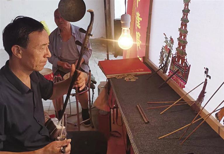 環(huán)縣道情皮影戲的價值主要體現在優(yōu)美獨特的道情音樂唱腔和精湛的皮影制作及表演上。戲班演出時,前臺一人挑扦表演,并承擔所有角色的坐唱念白,后臺四五人伴奏并“嘛簧”,一唱眾和,粗獷高亢,獨具風格。伴奏樂器中的四弦、漁鼓、甩梆子、簡板均為自制,音色獨特,傳唱劇目有180余部,至今還保留著“圖”“卷”等古老文化符號。