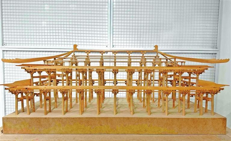 “這是兩個學生共同完成的,是按照大明宮含元殿的木制結(jié)構(gòu)圖制作的。”彭維新說。