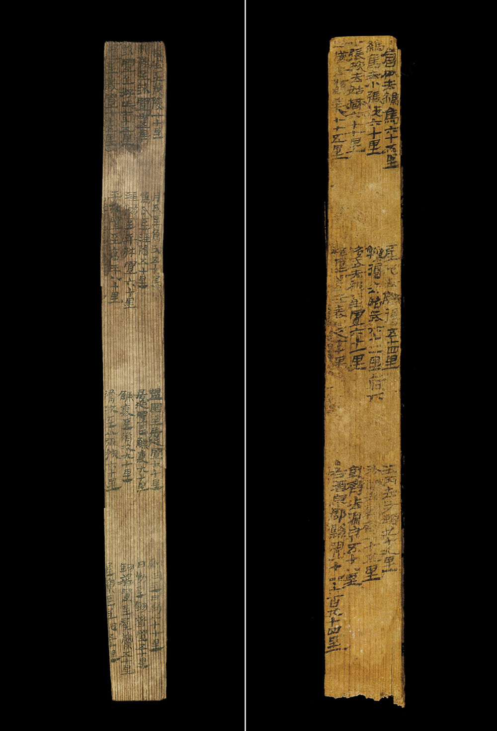 拼版照片:漢簡《居延里程簡》(左圖)和《懸泉里程簡》。1974年出土于今內(nèi)蒙古自治區(qū)額濟(jì)納旗破城子遺址的“居延里程簡”,詳細(xì)記載了從漢代長安出發(fā)至張掖郡20個(gè)驛置名稱及間隔里程。1990年出土于敦煌懸泉置遺址的“懸泉里程簡”,記載了河西走廊地區(qū)武威郡到敦煌郡12個(gè)驛置的詳細(xì)信息。新華社發(fā)(甘肅簡牘博物館供圖)