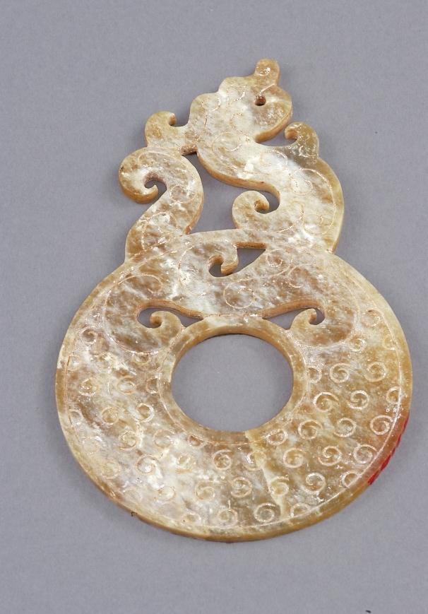 甘肅省博物館藏的漢代鏤雕龍紋璧,龍昂首,軀體屈曲,尾部上卷貼于首后,有騰空而起之勢(shì)。龍形玉器表現(xiàn)了古人將龍融入禮器之中,希望借此上達(dá)天庭,得到神靈與祖先的庇佑。