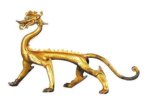 河南偃師的二里頭遺址出土了夏代龍文物,說(shuō)明此時(shí)龍已經(jīng)成為身份、地位的象征。商代開始,龍的突出特征便是有了角,并多以夔龍紋等形象出現(xiàn)在青銅器上。春秋戰(zhàn)國(guó)時(shí)代是一個(gè)大變革、大發(fā)展的時(shí)代。與政治上諸侯爭(zhēng)雄、思想界百家爭(zhēng)鳴、陰陽(yáng)學(xué)說(shuō)盛行相適應(yīng),龍的圖案中出現(xiàn)了“群龍”和“交龍”形象。如甘肅省博物館收藏的戰(zhàn)國(guó)盤龍紋金飾片,兩條龍交叉盤繞,龍首一側(cè)飾兩條小龍,龍尾一側(cè)飾一對(duì)小虎,作咬噬龍尾狀,龍身上飾聯(lián)珠紋。隨著華夏大地結(jié)束戰(zhàn)亂,走向一統(tǒng),秦漢時(shí)代的龍出現(xiàn)相對(duì)規(guī)范和定型的趨勢(shì),并出現(xiàn)了背上長(zhǎng)翅膀的龍。魏晉南北朝時(shí)期龍形象對(duì)內(nèi)融合各少數(shù)民族文化,對(duì)外融合佛教文化,流行的龍紋頭部扁長(zhǎng),角似鹿角,發(fā)鬣后披,挺胸奮肢,呈現(xiàn)出矯健奔放、線條流暢、氣韻生動(dòng)的特點(diǎn)。