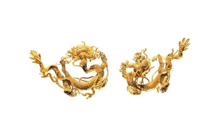 甘肅省博物館藏的明代累絲金龍,龍首聳額巨目,鬣發(fā)飛揚(yáng),神情兇猛;龍足屈伸相應(yīng),利爪如鉤;龍身似盤似舒,蜿蜒多態(tài);龍尾分叉,形狀如葉,輕輕擺動(dòng),飄帶般長(zhǎng)須刻畫出金龍瀟灑自由的雄姿。