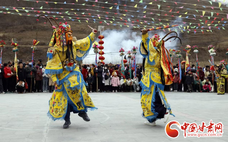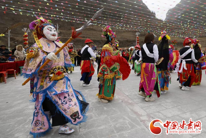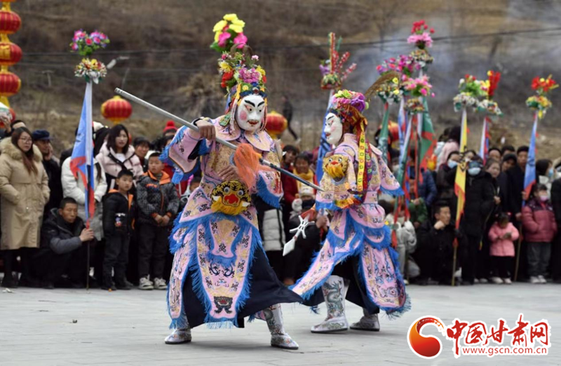 2024年2月19日,甘肅省隴南市武都區(qū)魚(yú)龍鎮(zhèn)柏家溝村,村民在表演當(dāng)?shù)靥厣珓》N、國(guó)家級(jí)非物質(zhì)文化遺產(chǎn)——高山戲。