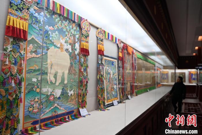 圖為精品唐卡展廳內(nèi)展出的交巴加布與父親的唐卡作品,常吸引游人“打卡”。九美旦增 攝