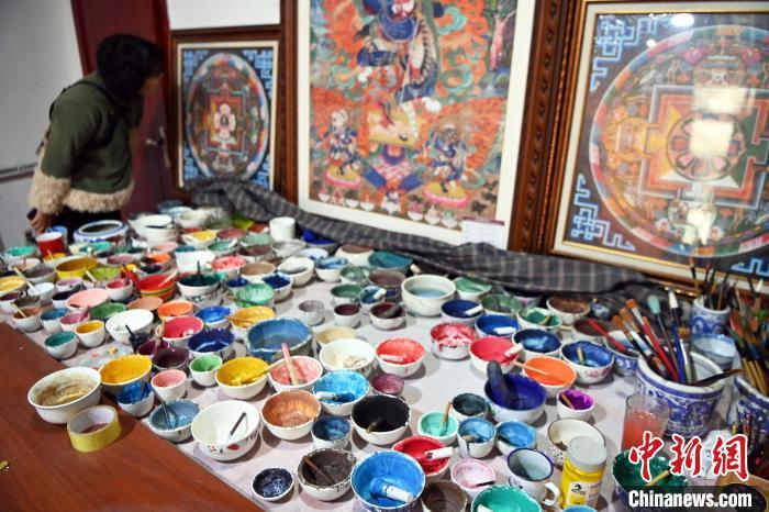 圖為唐卡小鎮(zhèn)一畫室內(nèi)擺出大大小小已完成的唐卡和各色顏料。唐卡具有鮮明的民族特點和獨特的藝術(shù)風(fēng)格,采用金、銀、珍珠、瑪瑙、珊瑚、松石、孔雀石、朱砂等珍貴的礦物寶石和藏紅花、大黃、藍靛等植物為顏料。九美旦增 攝