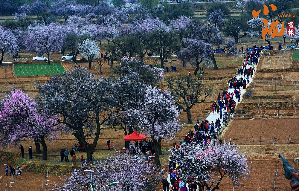 遠(yuǎn)遠(yuǎn)望去,到處是枝節(jié)橫生的杏樹,處處是農(nóng)家小舍,隱藏其中,人在花中,花在眼前。前來賞花的游客蜂擁而至,在杏園里駐足拍照,流連忘返。