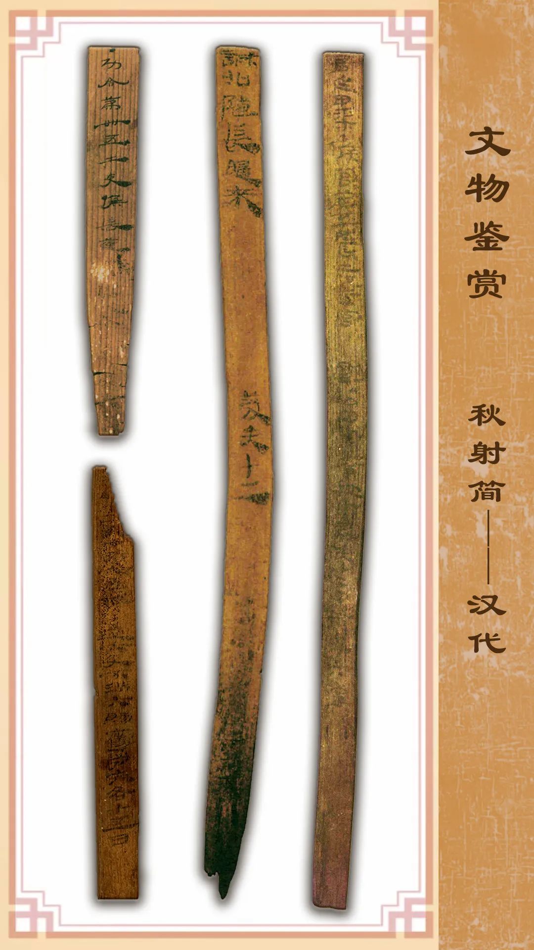 這是漢代邊塞有關(guān)“秋射”的一組散簡(jiǎn)(出土編號(hào)分別為:EPT52:95、EPT53:34/41、EPT11:1),都是一行書寫。1974年出土于甲渠候官遺址。其中一枚簡(jiǎn)(EPT53:34)是關(guān)于邊塞軍官秋射考核的令文;兩枚簡(jiǎn)(EPT52:95、EPT53:41)是秋射考核記錄;簡(jiǎn)EPT11:1記錄了秋射賜勞的規(guī)定。