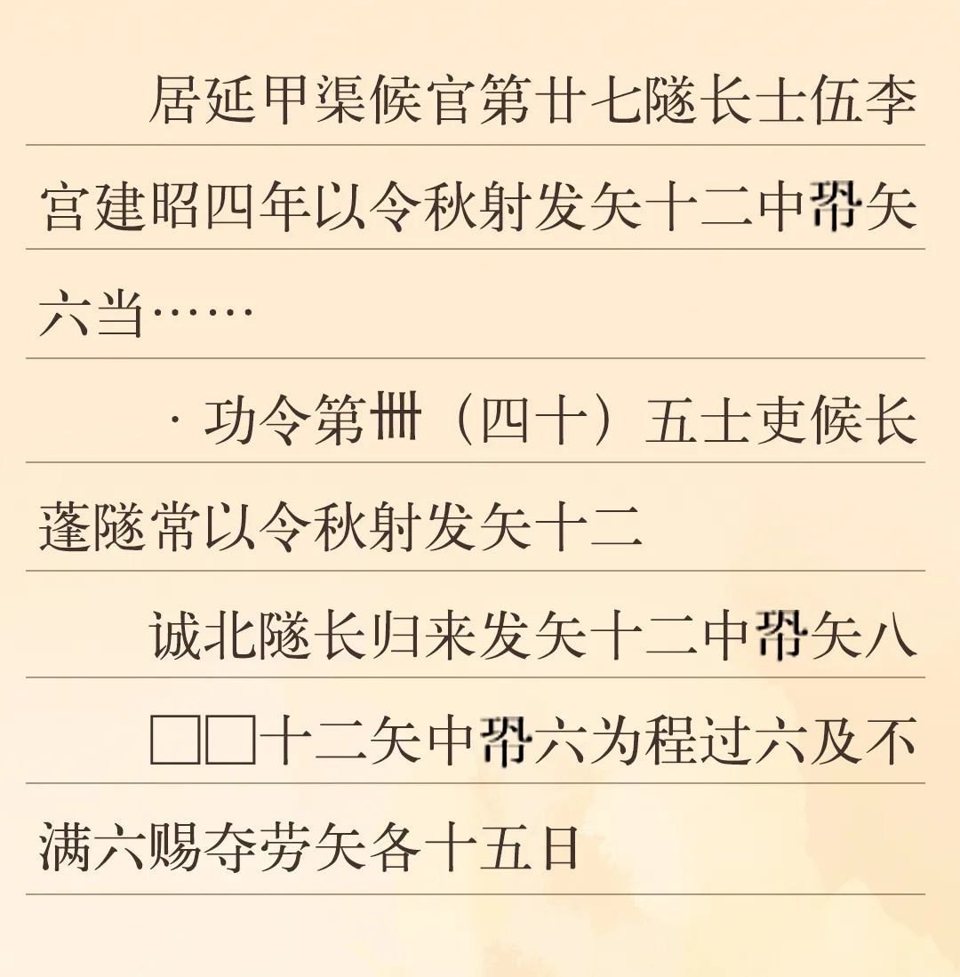 漢代對(duì)于官吏的考核分為文職和武職。文職主要考核書寫能力、治理能力、財(cái)務(wù)能力、法律能力等;武職考核主要是一年一度的射箭考核,因?yàn)樵谇锛九e行,故稱為“秋射”,發(fā)十二箭,中六箭為合格(即“中程”)。河西邊塞的官府通過秋射這一活動(dòng),借以考察和檢驗(yàn)邊塞吏員們的軍事技術(shù)水平,并以此作為賜勞和奪勞的依據(jù)。為了提高吏員們的射箭技術(shù),邊塞官府還派專人來管理訓(xùn)練吏卒。邊塞參加秋射的主要是烽燧的燧長(zhǎng)、部塞的候長(zhǎng)、候官的候等吏員。
