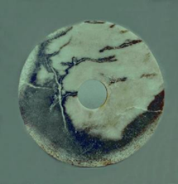 玉璧(編號總0129:4)直經(jīng)13.8厘米,單面鉆孔,大端孔徑5.2厘米,小端孔徑4.8厘米,璧面厚度不均勻,0.4~0.65厘米。