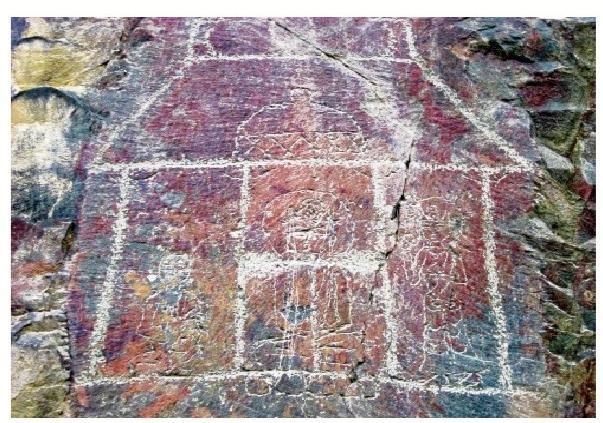 黑山巖畫中的晚期巖畫,主要反映宗教文化。紅柳溝、石關(guān)峽口巖畫中的殿堂、佛塔、佛像、古藏文題刻,可能屬于唐代中期以后的宗教遺物。藏傳佛教在 7世紀(jì)時同古藏文一起為吐蕃松贊干布創(chuàng)立。據(jù)史書記載,唐因平定“安史之亂”,河西空虛,吐蕃乘機占領(lǐng)河隴之地達(dá) 100 余年。吐蕃人居住河西,在紅柳溝、石關(guān)峽刻畫佛教殿堂、菩薩、佛像、佛塔是完全可能的。由此推斷,黑山紅柳溝、石關(guān)峽口佛塔、佛像及藏文題刻為唐中期以后的吐蕃所留。
