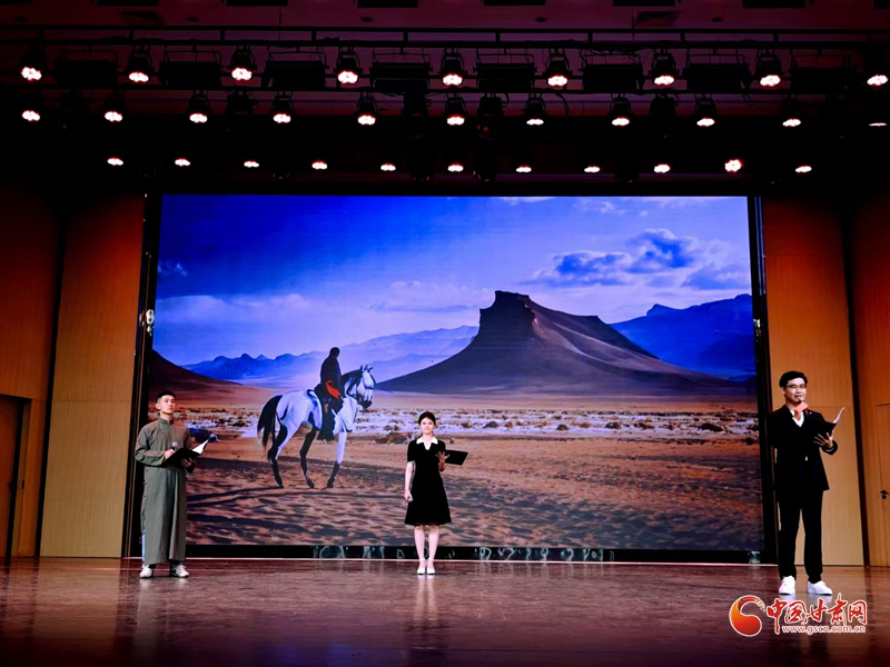 詩朗誦環(huán)節(jié)選取了著名詩人昌耀的《在敦煌名勝地聽駝鈴尋唐夢(mèng)》、葉舟的《大唐西域記》、汪小平的《蘭州、別樣的城市》以及項(xiàng)目主持人徐兆壽的《尋找昆侖》《敦煌之光》等。這些作品都取材自絲綢之路,學(xué)員們以詩歌朗誦的形式,抒發(fā)了詩人對(duì)絲綢之路的贊美之情,展現(xiàn)了絲綢之路的壯麗景色和豐厚的歷史文化內(nèi)涵,仿佛令人置身于充滿傳奇色彩的古道。最后,全體學(xué)員與舞蹈演員合唱歌曲《等你在涼州》,將演出推向了高潮。