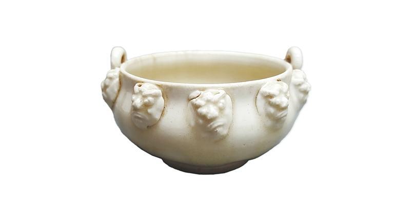 胎白質(zhì)細,內(nèi)外垂?jié){淚痕處閃青,足底無釉,采用模印和堆貼技法。大口短頸,鼓腹內(nèi)收,口外附二個對稱的環(huán)形耳,耳根部飾三個鉚釘形圓餅,兩耳間各貼五個怒目圓睜的頭面像。
