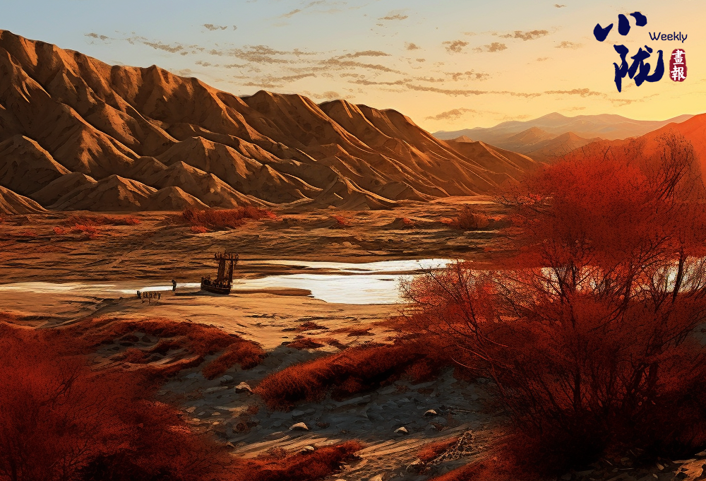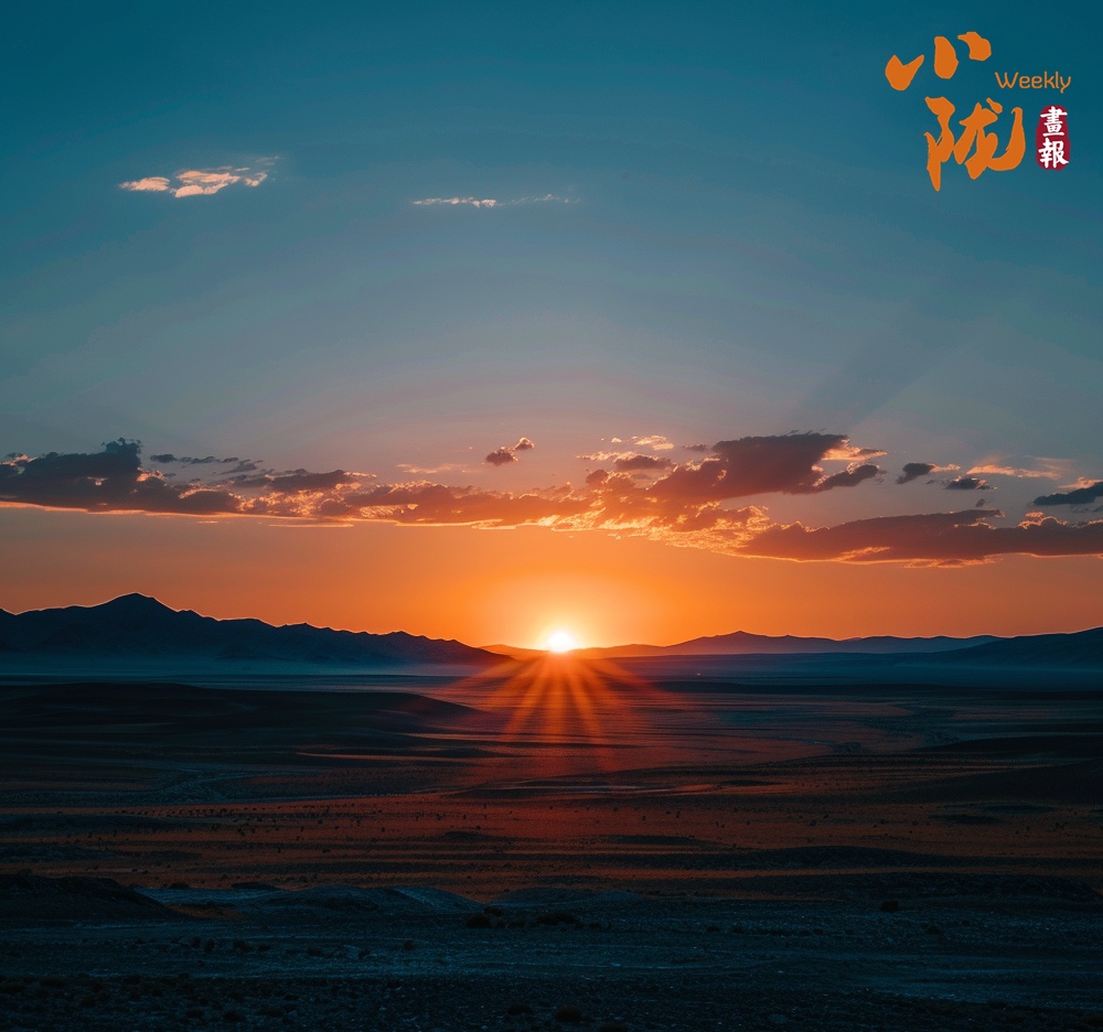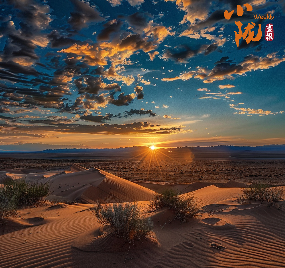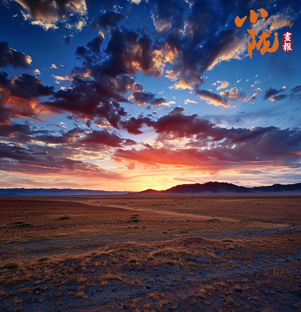 沙漠的沙粒在晚霞的映射下變得金黃而溫暖,仿佛覆蓋了一層光暈。遠(yuǎn)處的山峰也被晚霞點(diǎn)亮,宛如一座座火焰般迎接著夜晚的到來。