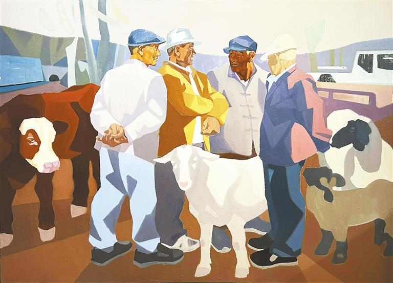 《和風(fēng)》系列作品取材于禮縣鹽官鎮(zhèn)騾馬市場逢集時交易的場景。幼時,我經(jīng)常隨父親去鹽官騾馬市場趕集,對這個場景熟悉且親切。也正因?yàn)槿绱?,我對這個題材有著難以割舍的情愫,總是忍不住想通過畫筆呈現(xiàn)這一記憶。