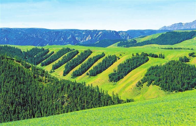 站在山頂一處觀景平臺(tái),放眼四周,滿目蒼翠,層巒疊嶂。祁連云杉環(huán)繞半山腰,山杏、樟子松、沙棘等樹(shù)木縱橫成行,微風(fēng)拂過(guò),綠浪涌動(dòng)。