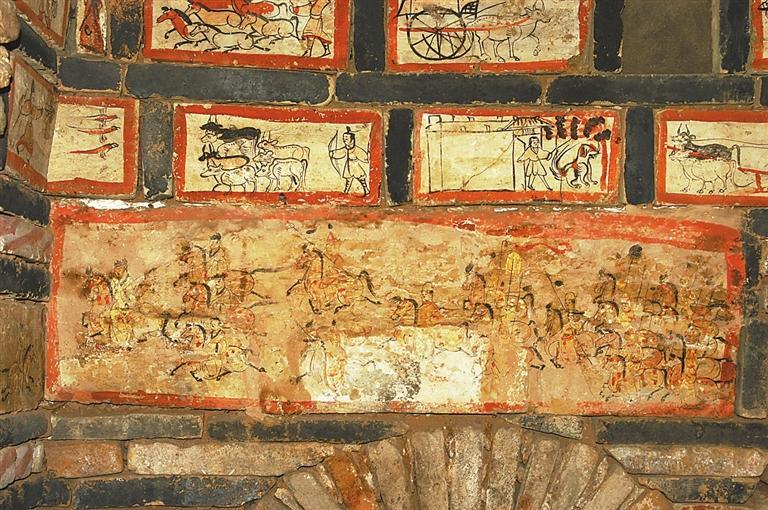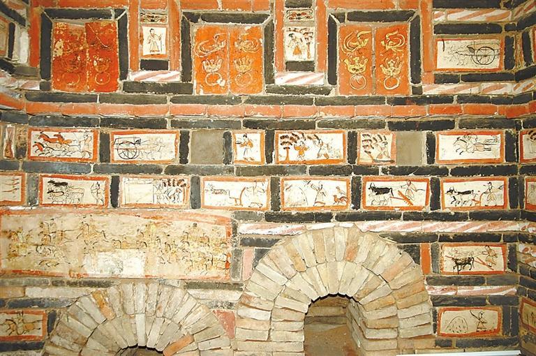 魏晉十六國磚畫在墓中的布局、組合,體現(xiàn)出 “滿”和“層”的特點(diǎn)。整個(gè)墓室,各方位、各邊角以及過道均鑲砌畫磚。以嘉峪關(guān)果園—新城5號(hào)墓畫磚的布局為例,各層間隔、同層緊鄰的畫磚,給觀者的感覺就是整幅壁畫,但每一塊又是一個(gè)獨(dú)立的畫面,這種“樣式”,是魏晉十六國時(shí)期的河西匠工、畫工,在繼承漢晉磚室墓的同時(shí),將畫像磚在墓室布局的方式也加以接受。艷麗的色彩,“忠實(shí)”生活的寫實(shí)手法,又是河西畫匠們的創(chuàng)新和發(fā)揮。
