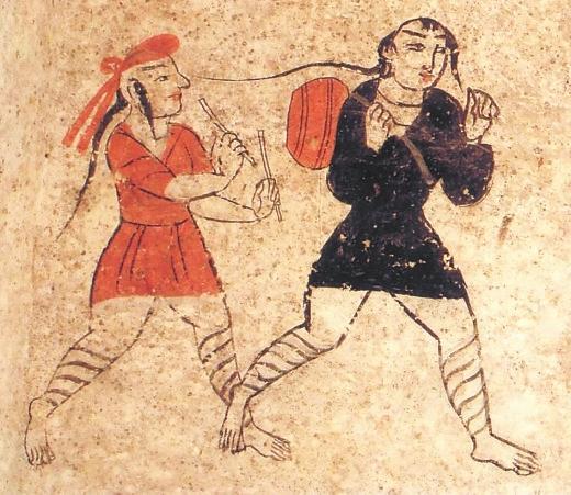 除此之外,河西彩繪壁畫磚圖像中,還有一些反映娛樂的圖像,主要有樂舞圖和六博圖。高臺(tái)地埂坡壁畫中的“角抵百戲”中,一著辮者在作表演,他小腿部網(wǎng)狀綁腿,蹲踞,雙手?jǐn)傞_,似乎是在表演魔術(shù),又似乎是在歡迎到場的人們。“擊鼓”中,兩人網(wǎng)狀繃腿,髡發(fā)梳辮,著黑裝者背鼓,著紅裝者持雙鼓槌準(zhǔn)備擊鼓。孫機(jī)先生謂,戰(zhàn)國迄漢盛行六博,博具和博戲的圖像在考古資料中不乏其例。甘肅以武威磨嘴子漢墓出土木六博俑為例。六博俑以簡單明確的藝術(shù)造型,刻畫了兩個(gè)老者全神貫注博弈的場面,惟妙惟肖地表現(xiàn)出對(duì)弈時(shí)蓄勢待發(fā)的場面。在高臺(tái)壁畫墓中的博戲場面略有不同,二博者戴船形帽,打手勢。從相貌看,很可能是少數(shù)民族。高臺(tái)出土彩繪壁畫磚上,兩人動(dòng)作幅度更大,左邊一人的黃紅色著裝和博具上的零散物品,顯得場面更為熱烈激情。