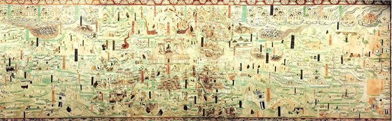 莫高窟61窟,建于五代晚期,是河西歸義軍節(jié)度使曹元忠及夫人開(kāi)鑿的功德窟,又稱(chēng)“文殊堂”,主要為供奉文殊菩薩而修。該窟的亮點(diǎn)是西壁的巨幅五臺(tái)山圖。這是敦煌壁畫(huà)中規(guī)模最大的山水人物圖,也是全景式歷史地圖。五臺(tái)山圖長(zhǎng)13.6米,高3.5米,畫(huà)中詳細(xì)描繪了東起河北正定,西至山西太原,方圓五百里的山川地形及社會(huì)風(fēng)情,再現(xiàn)了五代時(shí)期五臺(tái)山佛國(guó)圣境的氛圍。