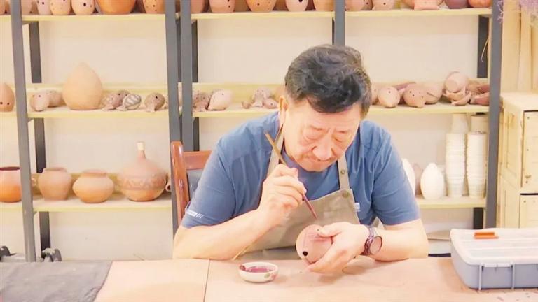 傳承人關(guān)振國在完成玉門陶塤的彩繪環(huán)節(jié)。