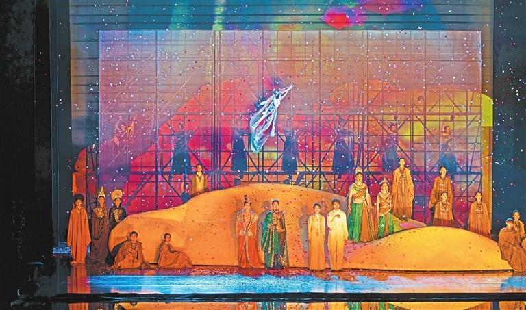 大型原創(chuàng)音樂劇《飛天》以“大愛”立意敘事,打破時空界限,利用現(xiàn)代舞美技術(shù),多維度、多角度、多層次地展現(xiàn)了敦煌石窟的無窮魅力,令觀眾身臨其境、沉浸其中,情感共鳴油然而生,獲得獨(dú)特的藝術(shù)體驗(yàn)。(本文配圖均為《飛天》劇照,由蘭州大劇院提供)