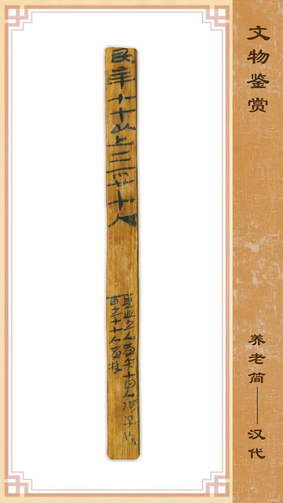 1990年出土于甘肅省敦煌懸泉置遺址,長22.8厘米,寬1厘米,紅柳材質。該簡記載分類統(tǒng)計高年老人享受的待遇,是西漢后期養(yǎng)老制度的反映。
