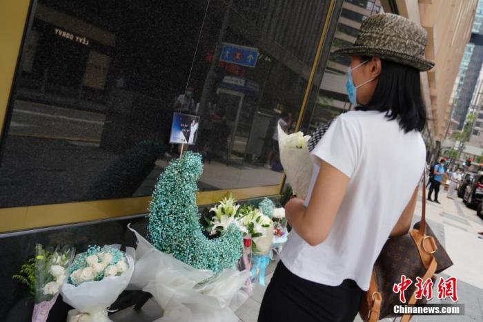 資料圖:2021年4月1日,歌迷和影迷來到香港文華東方酒店外獻(xiàn)上鮮花,擺上遺像,悼念張國榮。 中新社記者 張煒 攝