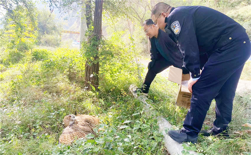 到達(dá)現(xiàn)場(chǎng)后,經(jīng)確認(rèn)該野生物種屬于國(guó)家二級(jí)保護(hù)動(dòng)物、雕鸮(貓頭鷹)。通過現(xiàn)場(chǎng)檢查,該貓頭鷹身體狀況良好,無外傷,活動(dòng)情況良好,具有野外生存能力,符合放生條件。于當(dāng)日,民警將其帶至野外放歸大自然。