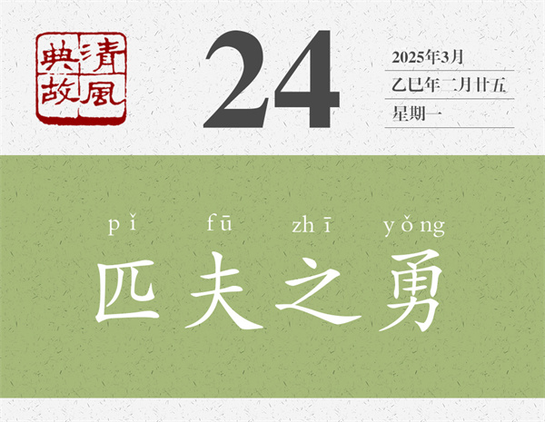 “匹夫”指平民百姓,也指平常人、一般人。起碼在孔子那里,還沒有貶義。《論語·子罕》:“子曰:‘三軍可奪帥也,匹夫不可奪志也。’”在韓非那里也一樣,《韓非子·有度》:“刑過不避大臣,賞善不遺匹夫。”但典出《國語》的“匹夫之勇”則用來指稱毫無智謀,單憑一己之力蠻干的勇氣,已經(jīng)沒有任何褒義了。《孟子·梁惠王下》:“王請無好小勇。夫撫劍疾視曰,‘彼惡敢當(dāng)我哉!’此匹夫之勇,敵一人者也。”孟子將“匹夫之勇”稱為“小勇”。蘇軾《留侯論》:“匹夫見辱,拔劍而起,挺身而斗,此不足為勇也。”蘇軾則將“匹夫之勇”視為“不足為勇”。