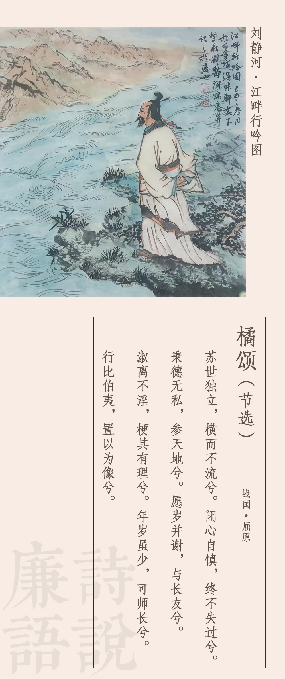 《橘頌》被譽(yù)為中國(guó)最早的詠物詩。據(jù)考證,屈原在流放之初,苦悶憤激,看到南國(guó)的橘樹,心有所觸,將橘樹人格化,賦予其君子仁人的品格,寫下了這首詩。詩分兩部分,前半部分寫實(shí),刻畫了橘樹的生長(zhǎng)習(xí)性和枝葉花果,后半部分抒情議論,托物言志,橘人合一,情景交融。這里節(jié)選了后半部分,大意如下:清醒立世啊不隨波逐流,小心謹(jǐn)慎啊過失從不留,沒有私欲啊與天地比儔,我與你同生死啊永結(jié)為好友,你形象美好啊耿直作一流,你風(fēng)華正茂啊堪為好師長(zhǎng),你高潔比伯夷啊榜樣最優(yōu)秀。
