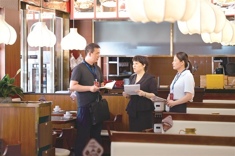 河南省漯河市郾城區(qū)紀(jì)委監(jiān)委圍繞公款吃喝、違規(guī)接受管理服務(wù)對象宴請等違反中央八項規(guī)定精神問題開展監(jiān)督檢查,一嚴(yán)到底狠剎歪風(fēng)邪氣。圖為近日,該區(qū)紀(jì)檢監(jiān)察干部在轄區(qū)某飯店了解相關(guān)情況。王曉 攝