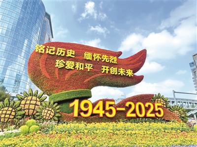 圖為紀(jì)念中國人民抗日戰(zhàn)爭暨世界反法西斯戰(zhàn)爭勝利80周年主題花壇。