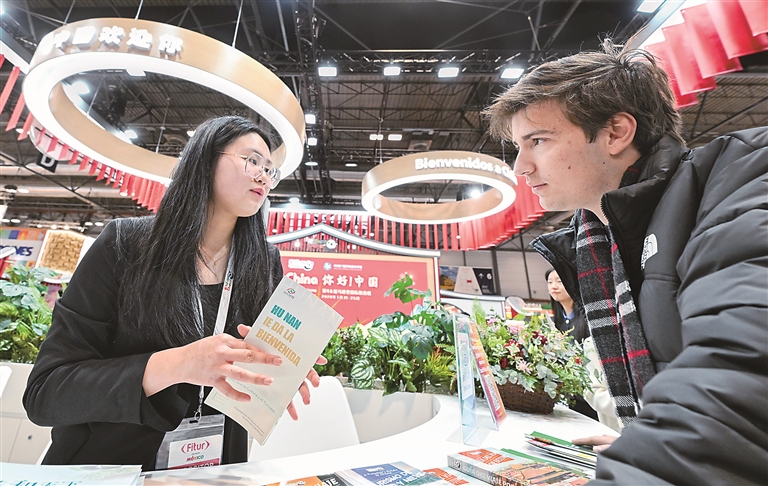 近年來,過境免簽政策持續(xù)擴容、免稅購物政策不斷優(yōu)化、“即買即退”適用商店持續(xù)增加……得益于中國日益開放的舉措,越來越多外國游客在中國旅游、購物,感受更加開放包容、多元創(chuàng)新的中國。圖為1月21日至25日舉行的馬德里國際旅游展上,參觀者在中國展臺咨詢。新華社記者 程敏 攝